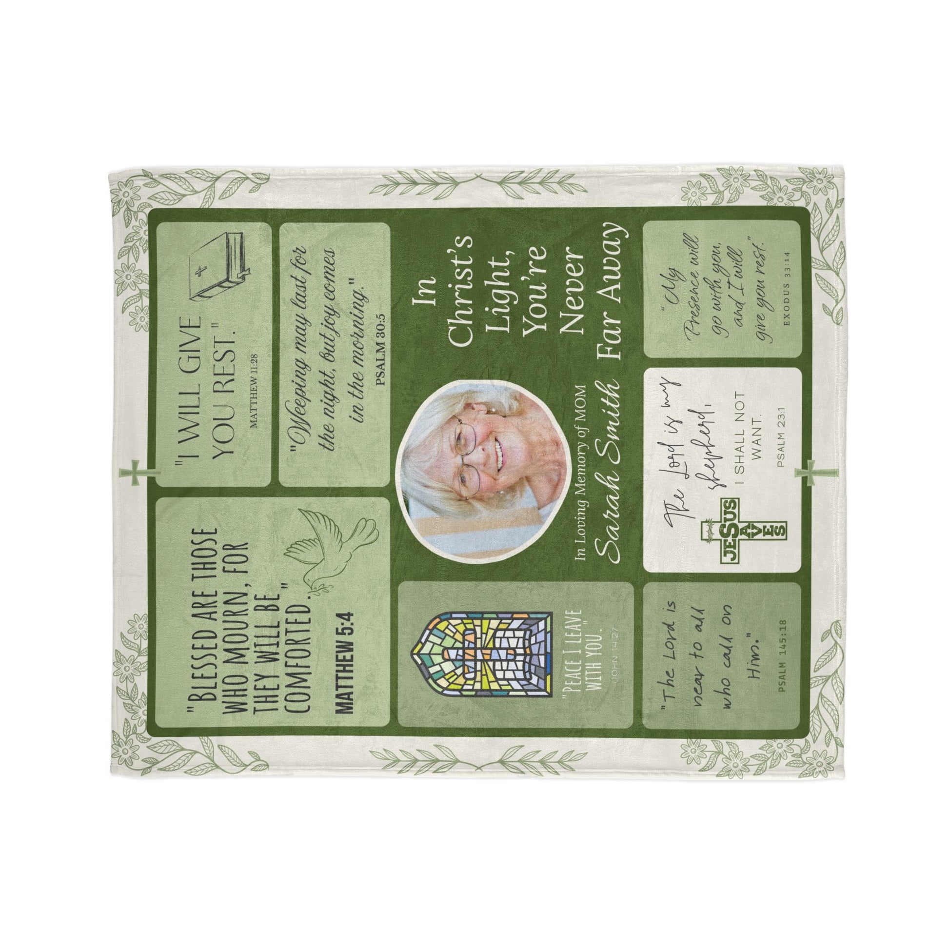 Honor your mother’s memory with a blanket that wraps you in both warmth and the promises of God. This Memorial Blanket features a peaceful collage of Bible verses—Matthew 5:4, Psalm 23:1, Exodus 33:14, John 14:27, and more—all displayed in serene shades of soft green and cream. At the center, your loved one’s photo and name create a personalized tribute that brings comfort during moments of remembrance. This blanket is crafted from ultra-soft polyester fleece, designed to offer emotional and spiritual comfort whether you’re resting, praying, or spending quiet time reflecting. A meaningful Christian sympathy gift for anyone grieving the loss of a beloved mother.