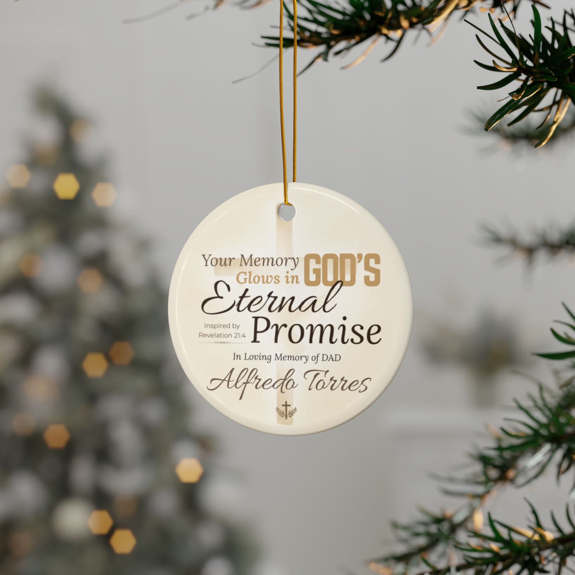 Honor your father’s life and legacy with the Eternal Promise Memorial Ornament, inspired by Revelation 21:4: “He will wipe away every tear from their eyes.” Featuring a radiant cross and warm golden hues, this design embodies peace, comfort, and the everlasting love of God.