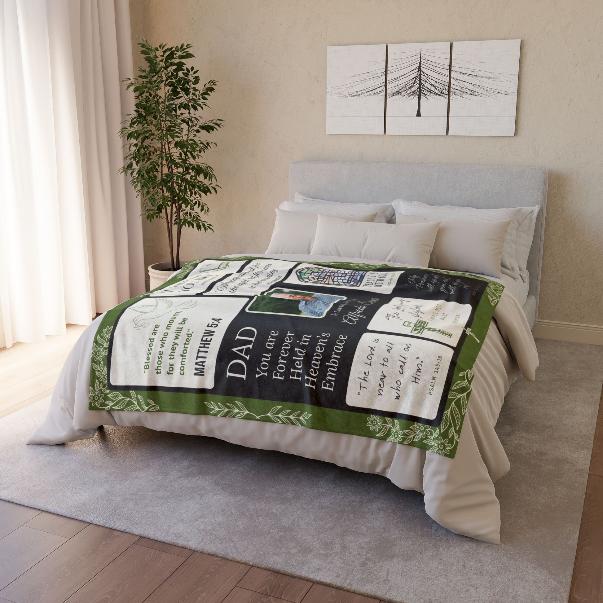 Heaven’s Embrace Memorial Blanket – Green Scripture Edition | Personalized Christian Sympathy Gift for Loss of Father