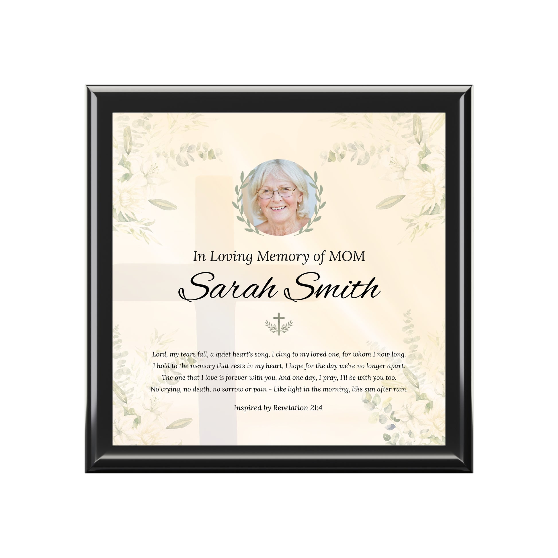 Personalized with your loved one’s photo and name, it’s more than a keepsake box — it’s a heartfelt tribute designed to bring peace and remembrance to your home. Crafted from high-quality rubberwood and lined with soft felt, it provides a safe and beautiful space to store jewelry, rosaries, small mementos, or cherished personal items. Perfect for memorial gifts, anniversaries, or simply as a daily reminder of faith, love, and eternal connection.